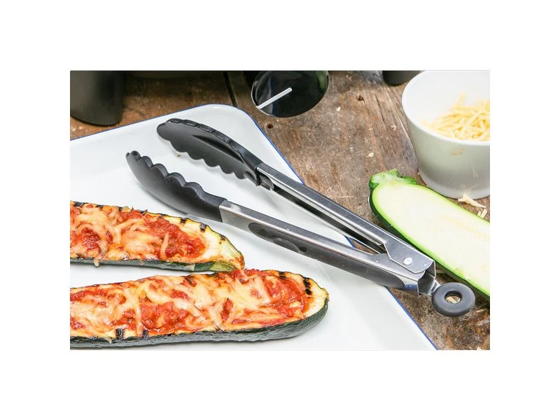 BBQ tang met siliconen handgreep en handig ophangoog. De tang is eenvoudig op te bergen dankzij het sluitingsmechanisme. Compact dus ook eenvoudig mee te nemen op vakantie.