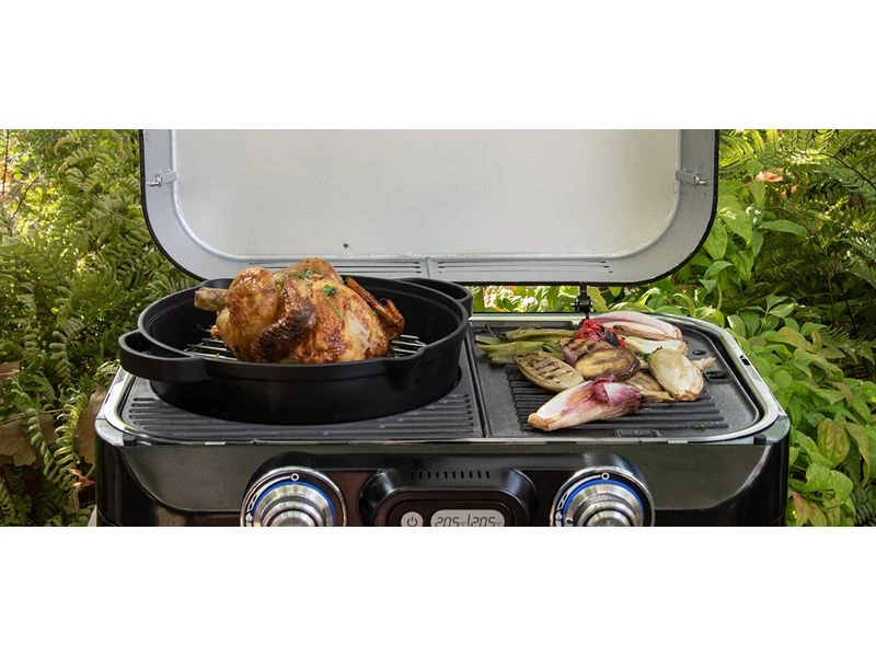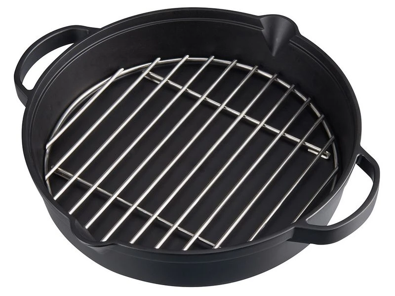 De gietijzeren braadpan met geïntegreerd roestvrij stalen rek biedt tal van gebruiksmogelijkheden. Braad grote stukken vlees of zelfs een hele kip, of verwijder het rek en maak een stoofschotel of apple crumble.
