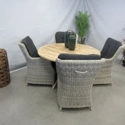 Deze set met de teak tafel met aluminium onderstel, geeft een warme uitstraling door het teakblad, en heeft een modern uiterlijk door het aluminium onderstel.