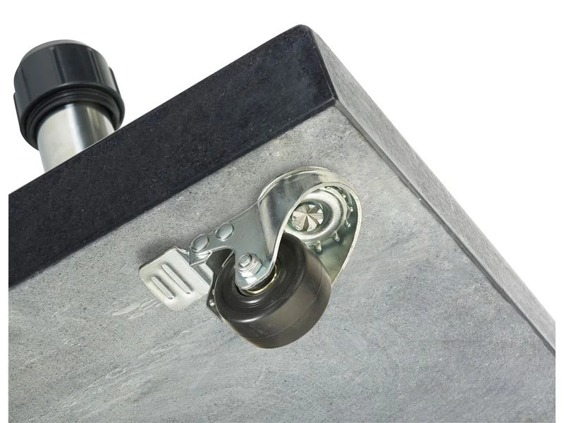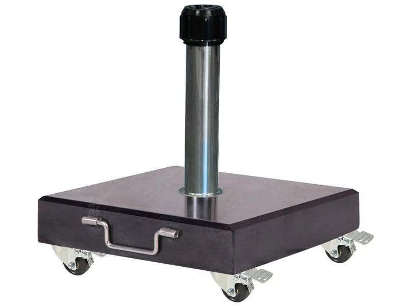 Zwart gepolijst graniet. Deze parasolvoet is makkelijk verplaatsbaar door zwenkwielen.