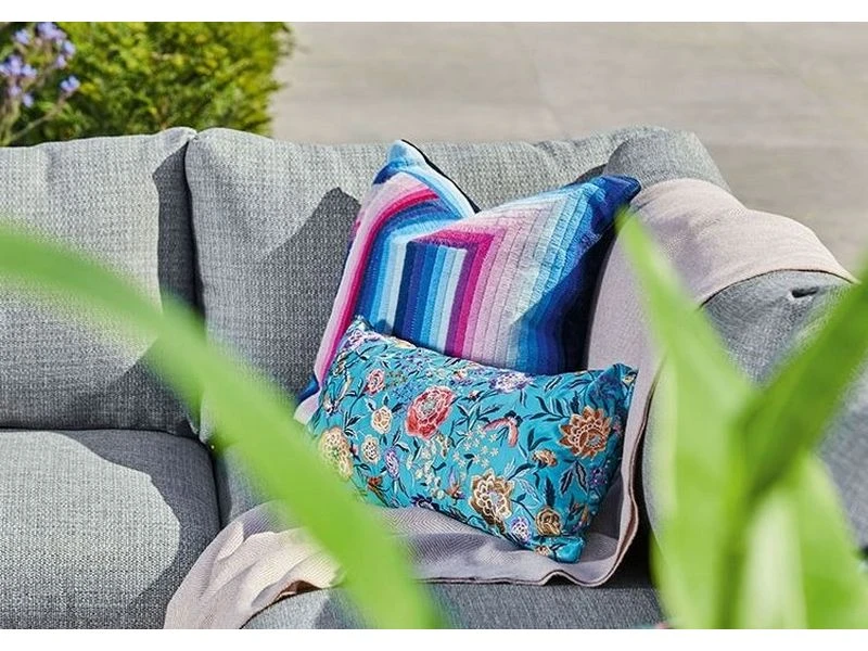 Het gebruik van sterke, duurzame en weerbestendige materialen maken deze loungeset bijzonder onderhoudsvriendelijk. Het aluminium frame is uitgevoerd in matt royal grey en geeft de set een industriële uitstraling. De verstelbare tafelbladen zijn van gecertificeerd teak: een sterke houtsoort die door een natuurlijk proces verkleurt tot een warm grijs. De kussens zijn waterafstotend en gemakkelijk schoon te maken.