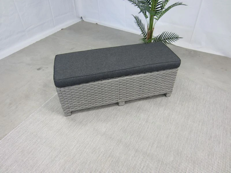 Dit handige 2-zits bankje is bij veel tuinsets combineerbaar. Het bankje is gemaakt van een aluminium frame met daar omheen een 10 mm – halfronde vlechtwerkdraad in de kleur blended grey. De bankje wordt uiteraard geleverd inclusief antracietkleurige kussen.