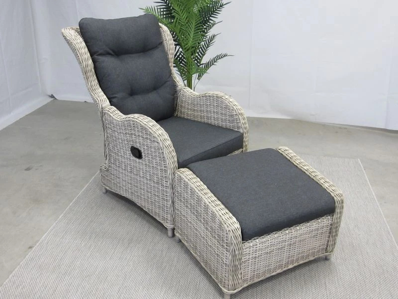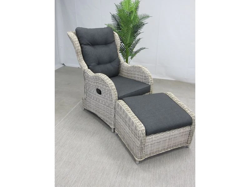 De Riverside gasveerverstelbare lounge stoel, is gemaakt van een aluminium frame met daar omheen een 6,5 mm halfrond vlechtwerkdraad in de kleur earl natural inclusief antracietkleurige zit- en rugkussens. Deze stoel wordt geleverd met voetenbank. Door de verstelling van de rug, kunt u altijd zitten op de door u gewenste manier.
