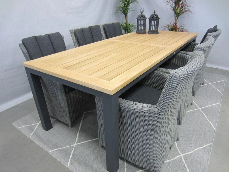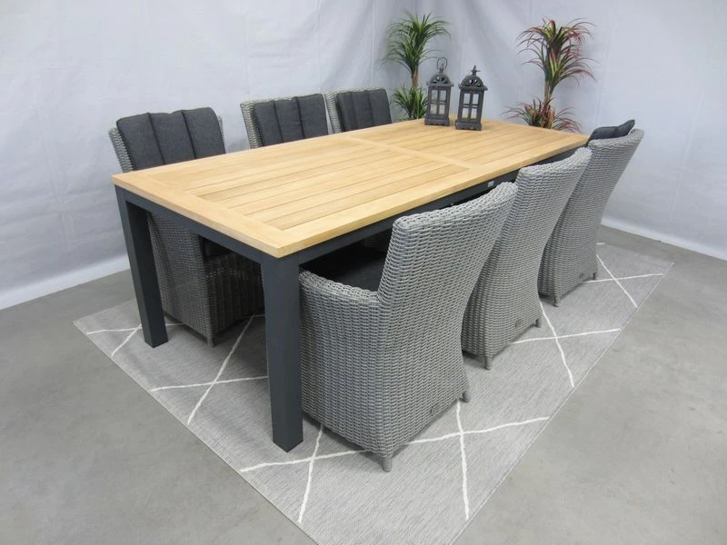 De alonzo tuinstoel heeft een hoog zitcomfort. Frame is van aluminium en het gevlochten draad is van kunststof. Deze dining-tuinstoel is geheel onderhoudsvrij. Het kussen is gemaakt van polyester, wat betekent dat het kleurecht is en vuil en waterafstotend is. De Palazzo teak-tuintafel heeft een Teak hout tafelblad en een aluminium frame dat een antraciet coating heeft. De tafel is 1 meter breed, 2,4 meter lang en 0,76 meter hoog.